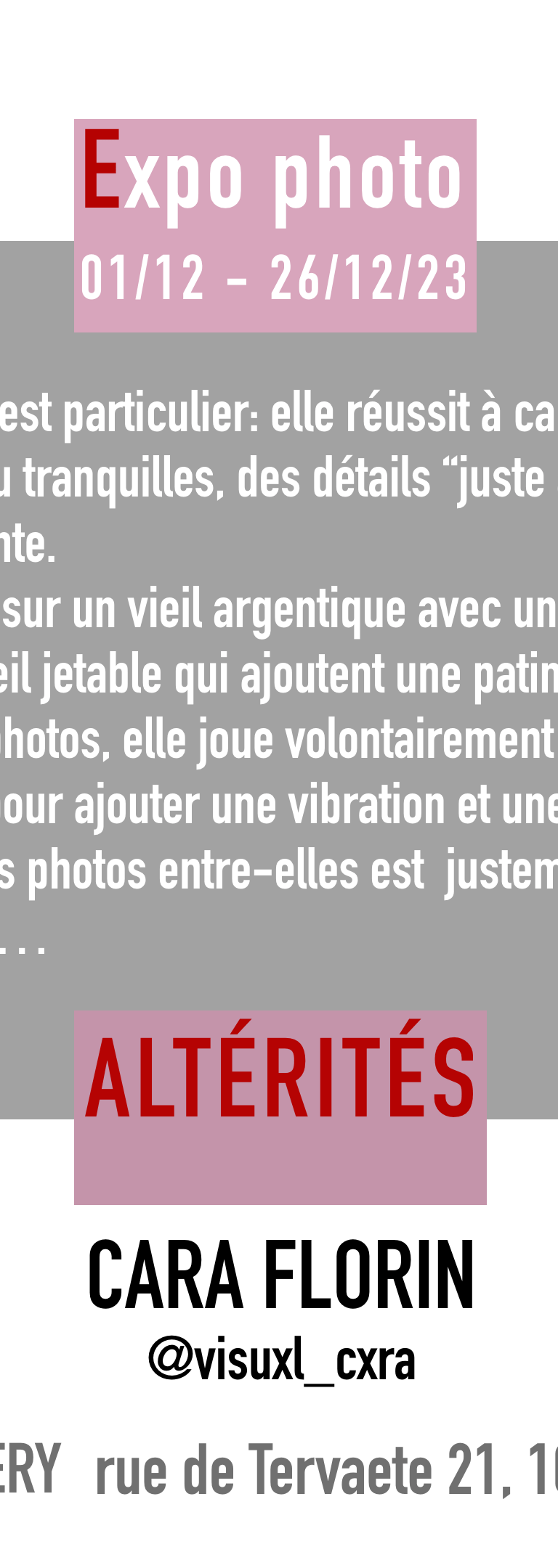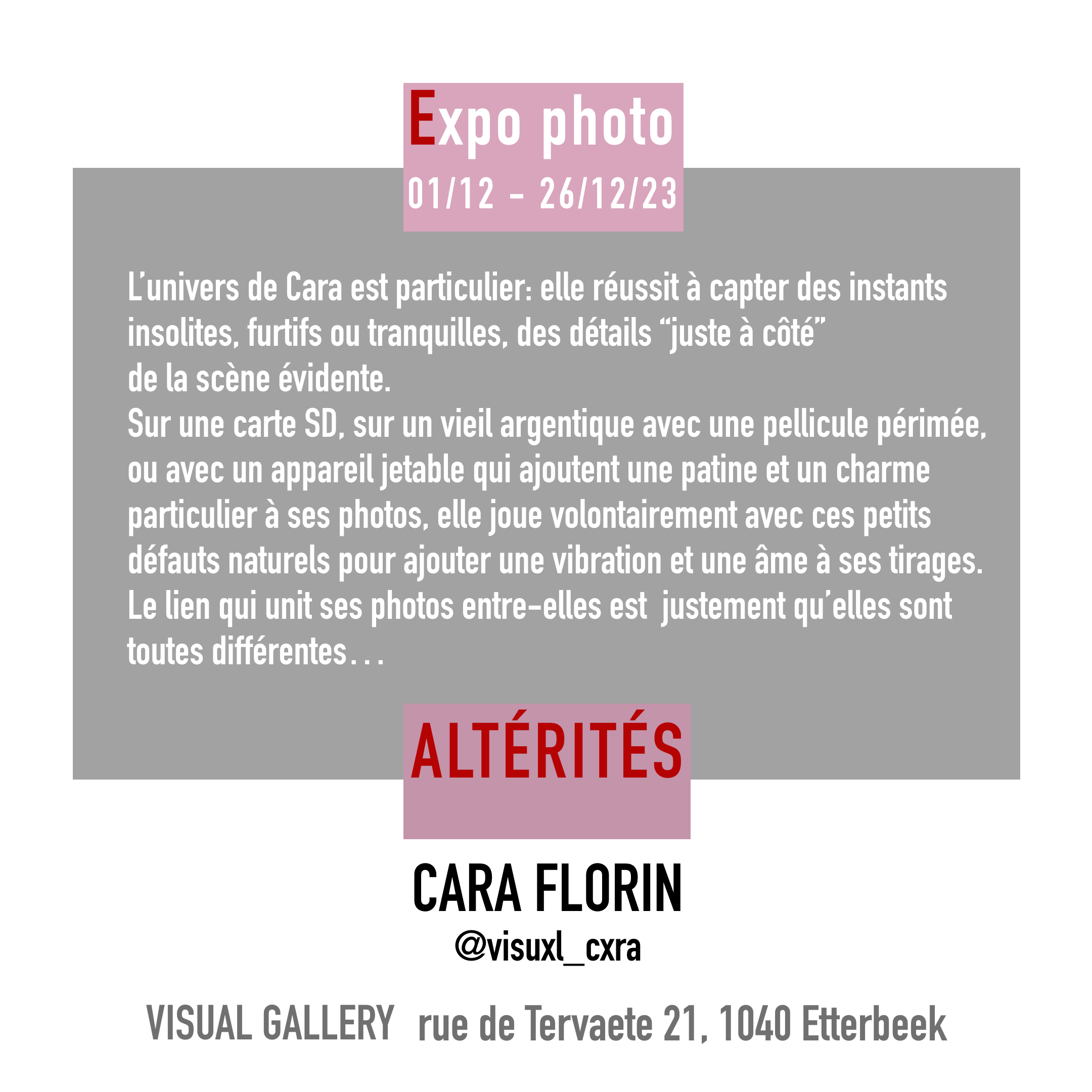 Lieu : Visual Gallery ( Rue de Tervaete 21-23 à 1040 Etterbeek)